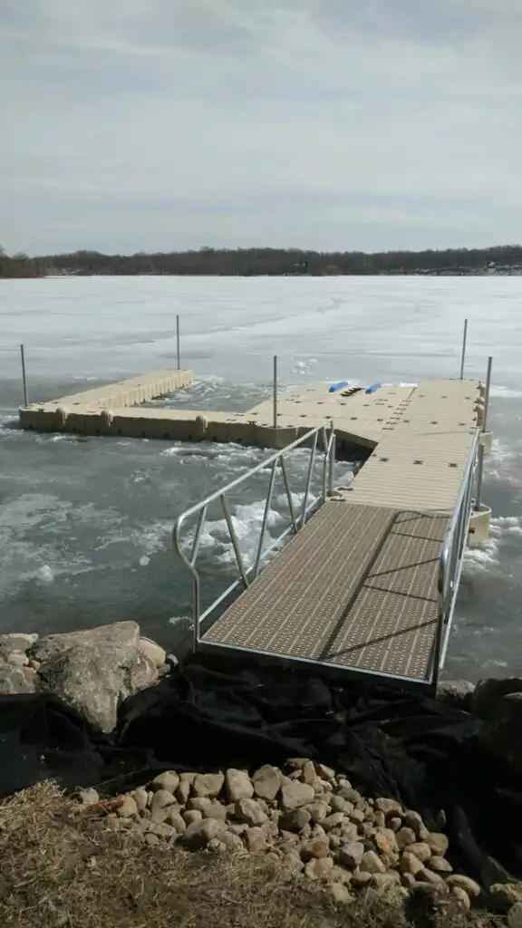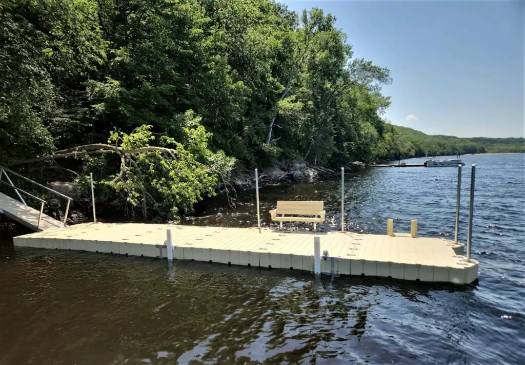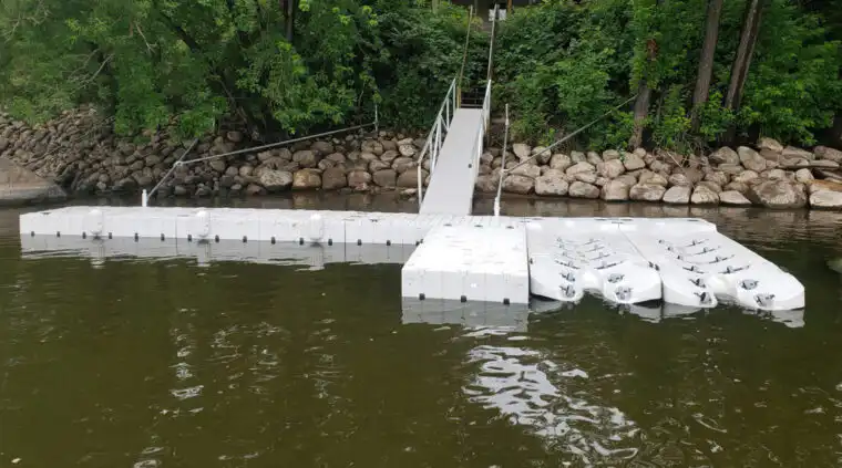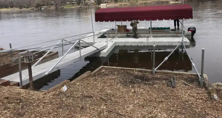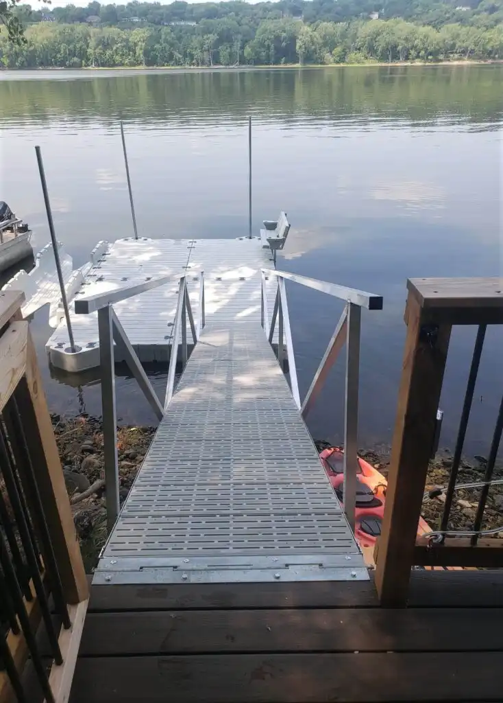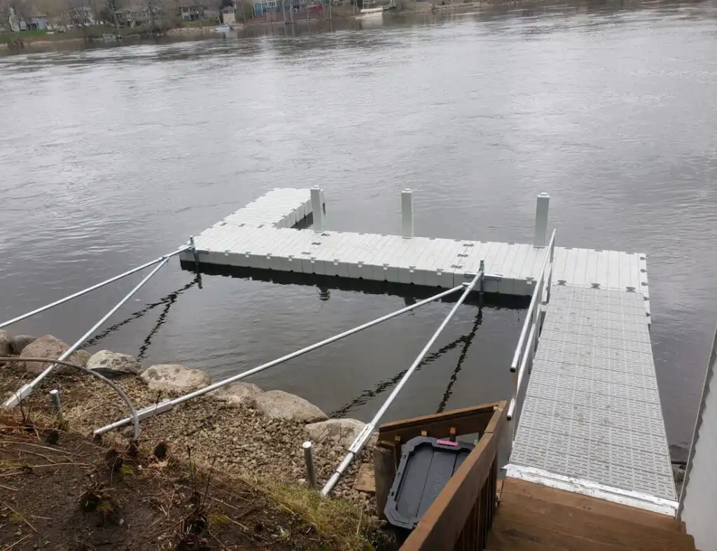 Marine Dock and Lift uses the EZ dock system almost exclusively for river applications. By using stiff-arm anchoring or vertical anchor posts, and long gangways, the floating EZ Dock is ideal for areas where water fluctuation is high, (5ft. to 9ft. is easily managed) and currents are swift.