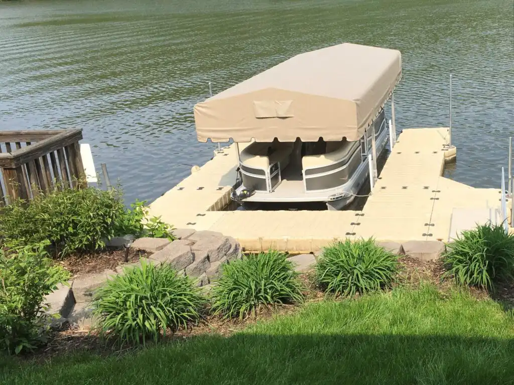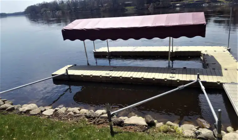 In the photo above the canopy is supported by 6 canopy support posts. The support posts sit inside of brackets attached to the floating dock. Depending upon the height of the boat or pontoon, we adjust the height of the support brackets to obtain the proper clearance. This ensures maximum coverage for the watercraft. As the boat or pontoon is floating, and with a floating dock, the canopy is always at the same height as the boat. Once set for the boat, it does not require adjustments throughout the boating season.